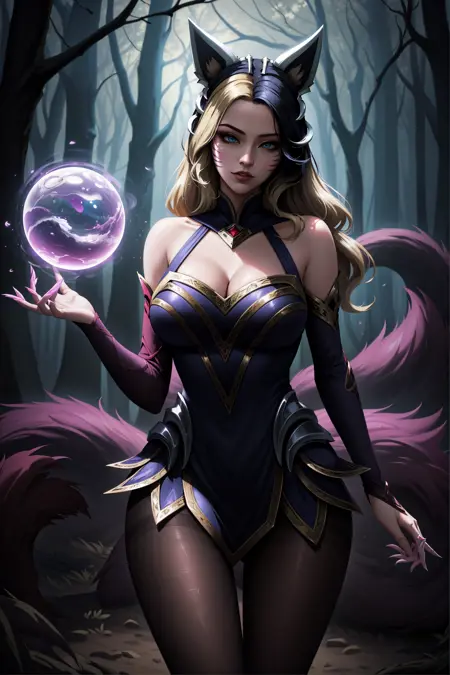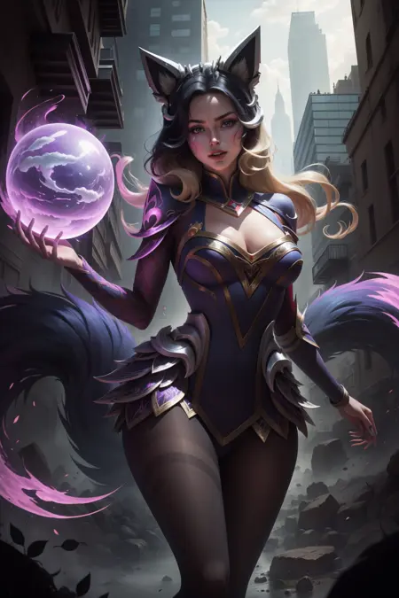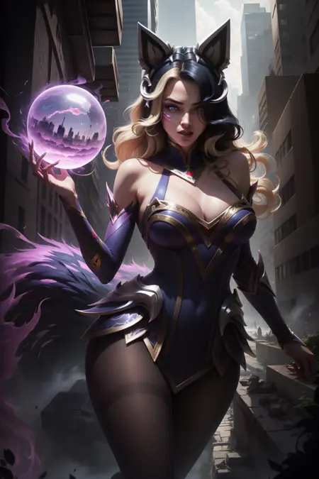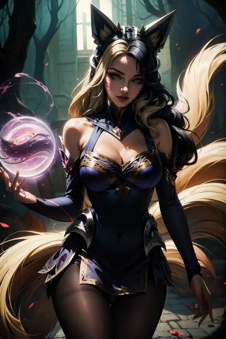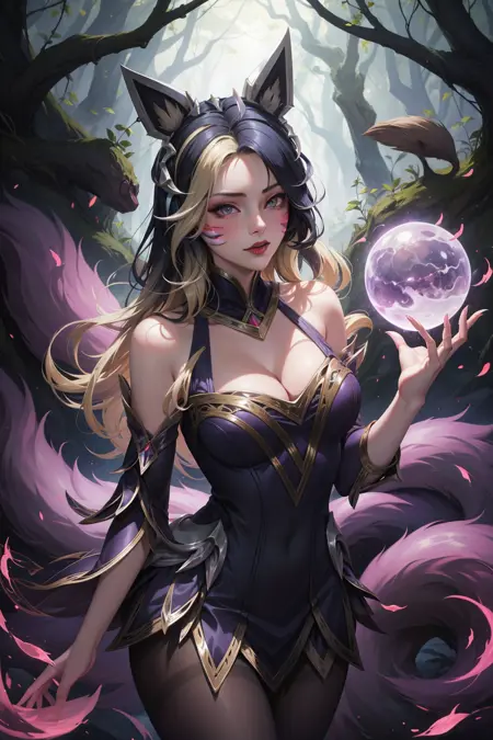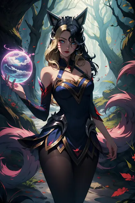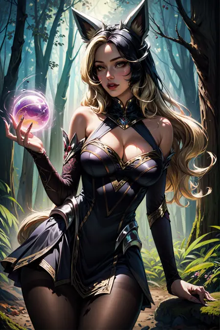 tags: coven ahri, 1girl, dress, detached sleeves, cleavage, multicolored hair, blonde hair, black hair, animal ears, pantyhose