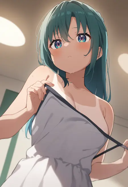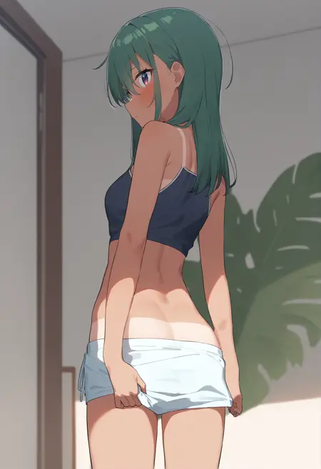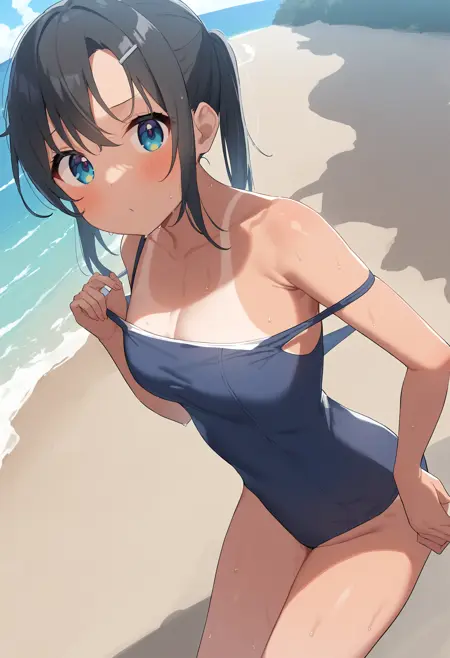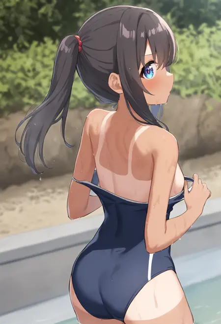 スクール水着が最も動作しやすいですが、他の水着や普段着でも一応効果があります。clothes pull、bare shoulders、pulled by self、swimsuit pull などのキーワードを適宜追加してください。ほとんどの場合、肩紐や胸元を引っ張りますが、時々下半身もめくって見せてくれます。