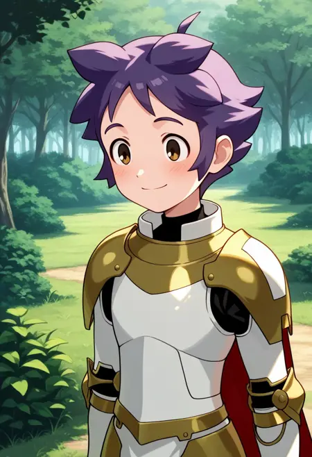KageHikar, 1boy, male focus, solo, brown eyes, purple hair, shirt, black shirt, armor, white and gold armor, cape, red cape