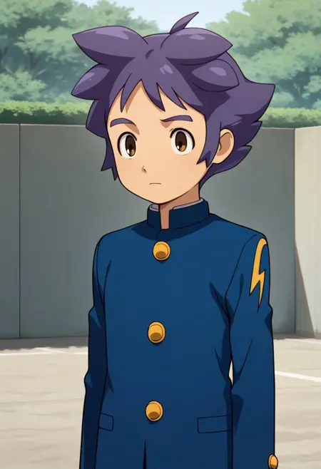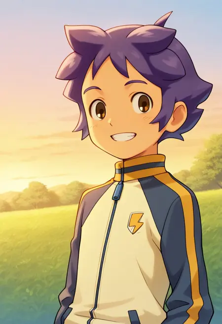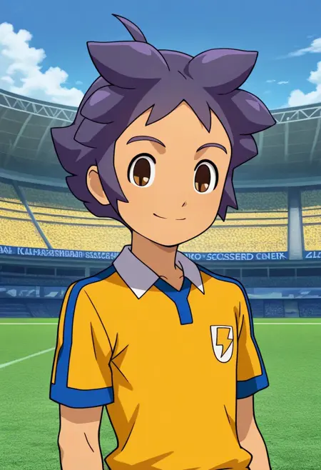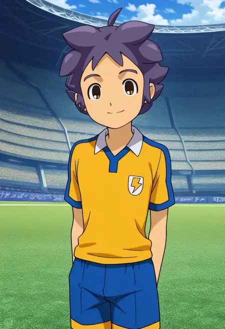 KageHikar, 1boy, male focus, solo, brown eyes, purple hair, raimon soccer uniform, shirt, yellow shirt, short sleeves, lightning bolt symbol, shorts, blue shorts, socks, blue socks, shoes, sneakers,