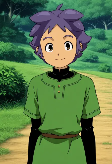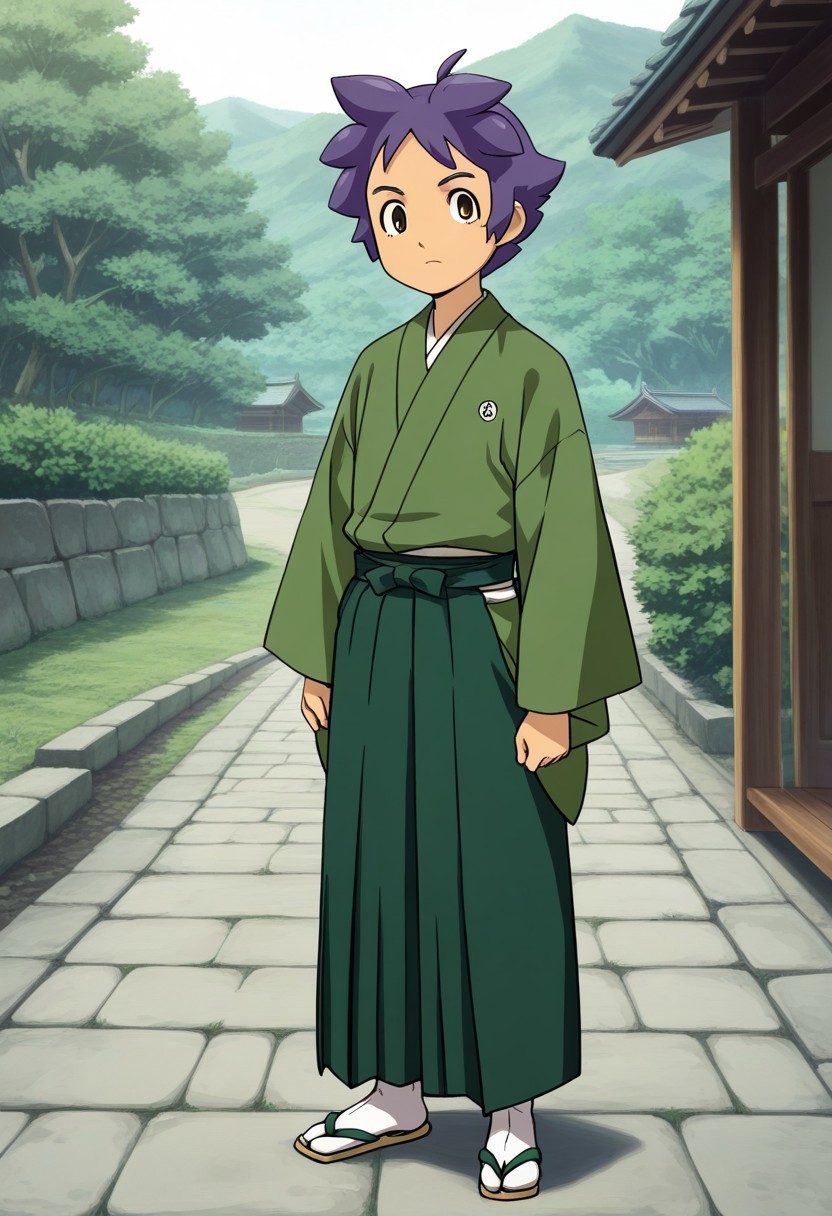 KageHikar, 1boy, male focus, solo, brown eyes, purple hair, tunic, green tunic, black shirt, short over long sleeves, pantyhose, boots, black footwear