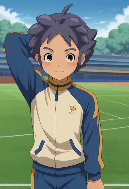 KageHikar,1名男孩,男性焦点,单人,棕色眼睛,紫色头发,雷门足球队制服,上衣,黄色上衣,短袖,闪电标志,短裤,蓝色短裤,袜子,蓝色袜子,鞋子,运动鞋,