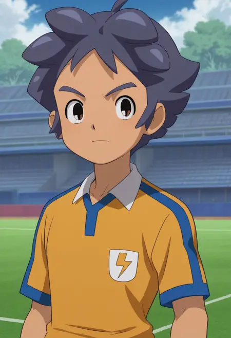 KageHikar, 1boy, male focus, solo, brown eyes, purple hair, raimon soccer uniform, shirt, yellow shirt, short sleeves, lightning bolt symbol, shorts, blue shorts, socks, blue socks, shoes, sneakers,