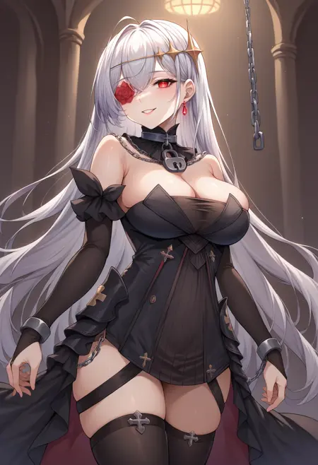 EmdenAlterEgo, red eyes, flower over eye, white hair, bangs, long hair, jewelry, earrings, padlock, chain, black dress, cleavage, large breasts, black thighhighs, detached collar, bridal gauntlets, strapless dress, detached sleeves