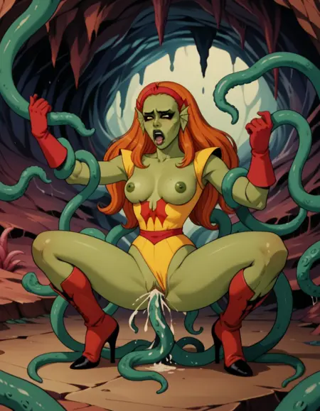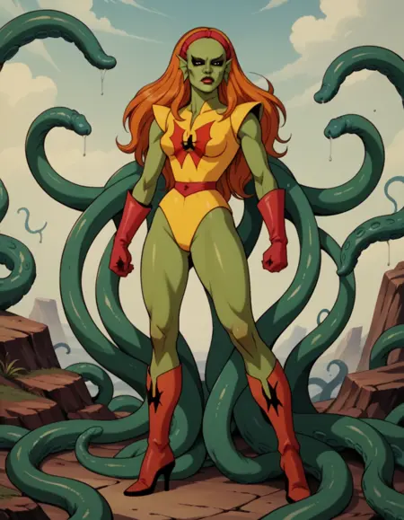 キーワード: hud_octavia_shera, 1girl, 緑色の肌, オレンジ色の髪, レオタード, 手袋, 髪留め, 背中に付いた触手, レトロなアートスタイル, 1980年代(スタイル),胸