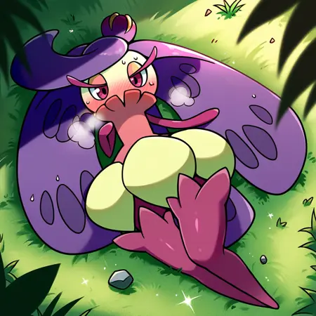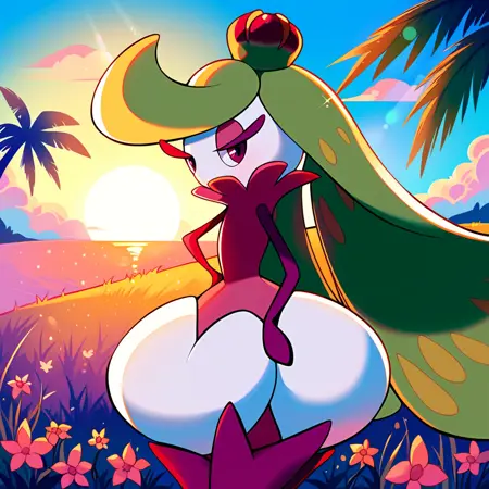 tsareena, pokemon_(creature), flora fauna, green hair, long hair, white head, eyelashes, pink eyeshadow, purple eyes, purple boots