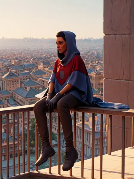복장: (파란색과 빨간색 후드) 이톤 클로크, (긴 소매 검은색) 언더셔츠, 장갑, 바지, 부츠