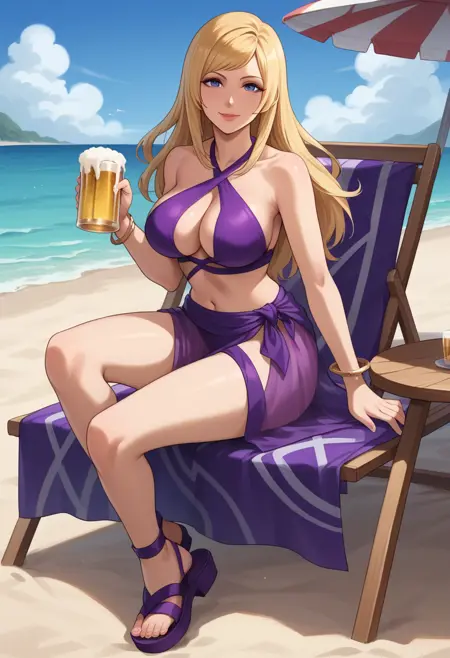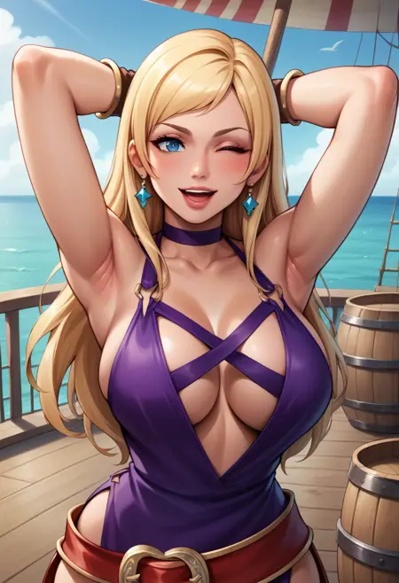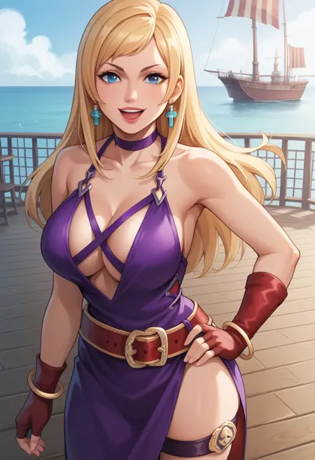 彼女のオリジナル衣装には「BJENET, 交差させた衣装、金髪、青い目、レザーグローブ、指なしグローブ、紫のドレス、胸元の開き、サイドスリット、紫のチョーカー、ベルト、太ももストラップ」を使用してください。