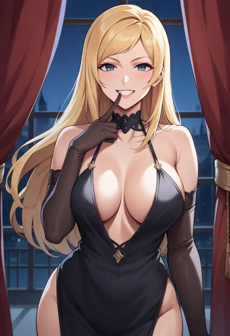 Use "BJENET, Cross-laced clothes, blonde, blue eyes, leather gloves, fingerless gloves, purple dress, cleavage, side-slit, purple choker, belt, thigh strap" for her original outfit