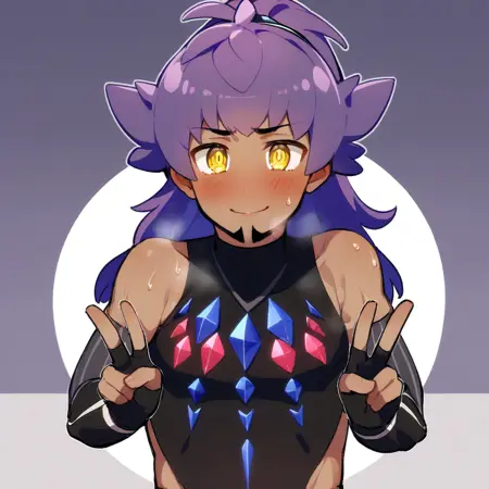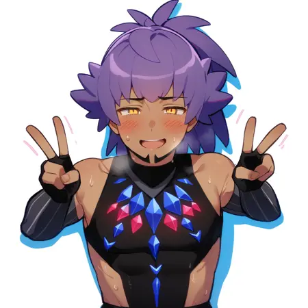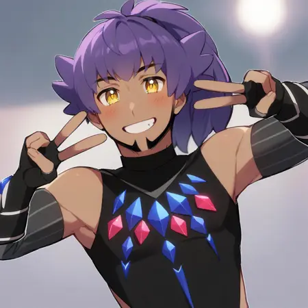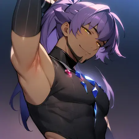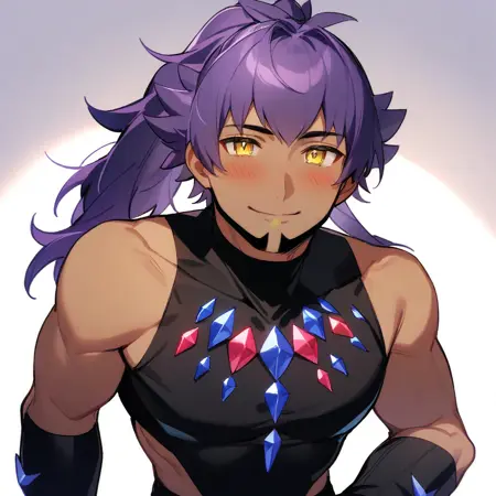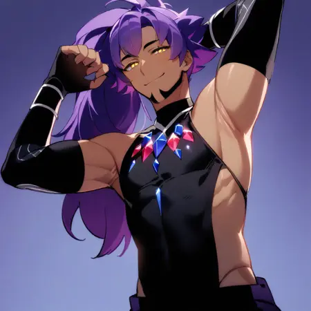 1boy, male focus, yellow eyes, dark skin, long hair, purple hair, ponytail, facial hair