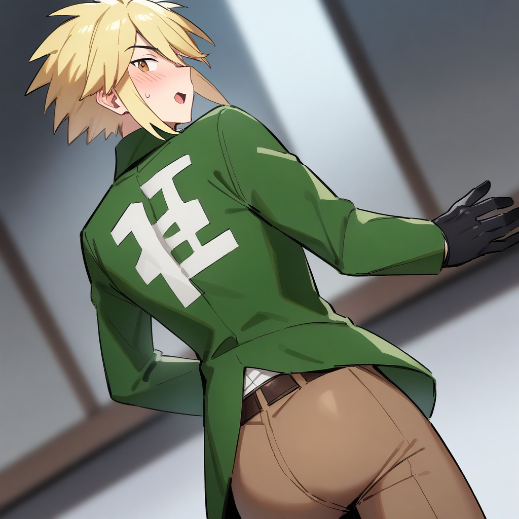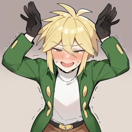 black gloves, white shirt, green jacket, belt, brown pants
