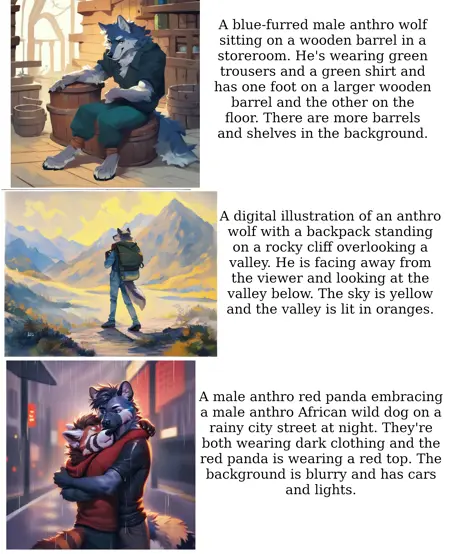 在发布时,我尚未发现任何公开可用的兽迷内容字幕模型,因此我以当前状态发布了它,尽管它很可能需要大量的微调和对生成描述的手动编辑。此后,JoyCaption的测试版已发布,根据你的需求,它可能提供更好的结果。但我仍会不定期发布本模型的新版本,只要我找到了改进方案。请注意,虽然新版本整体上应更好,但不幸的是在某些情况下仍会出现退化。
