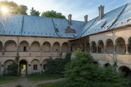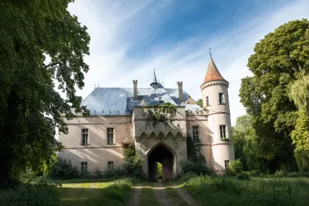 城堡为四翼建筑,配有两座角塔、一扇凸窗以及一个带有柱廊的中央庭院。部分采用擦刻技法装饰的立面由带有石制窗棂的窗户打破。文艺复兴时期的燕尾形阁楼在浪漫主义时期被降低,但在某些部位仍保留了其原始高度与细节。室内主楼梯上有一块铭文牌匾,上面绘有纹章,记录了1609年的文艺复兴重建与1816年的古典主义改建。入口大门处有阿尔贝特·埃米尔·冯·施泰格-明辛根·冯·雷勒及其妻子玛丽亚·朱迪丝·埃莱奥诺拉·欧仁妮·卢德米拉·扎莫伊斯卡的纹章,日期为1896年。内部天花板采用文艺复兴时期的十字拱顶、巴洛克式普鲁士拱顶和檐口拱顶,部分区域还可见法比翁镜面天花板,图书馆则设有木梁天花板。