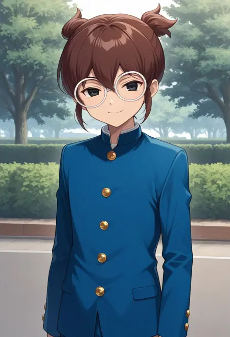 hayami, 1boy, 男性焦点, 单人, 黑色眼睛, 眼镜, 棕色头发, 双马尾, 校服, 学生制服, 外套, 蓝色外套, 长袖, 扣子, 裤子, 蓝色裤子,