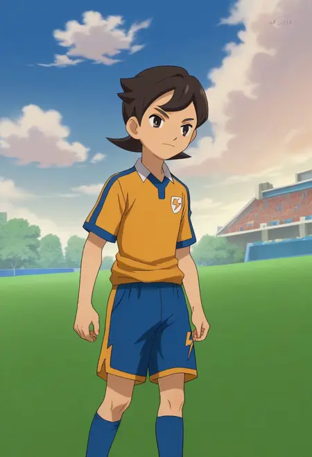 AoyamaShun, 1boy, male focus, solo, black eyes, brown hair, hair between eyes, raimon soccer uniform, shirt, yellow shirt, short sleeves, lightning bolt symbol, shorts, blue shorts, socks, blue socks, shoes, sneakers,