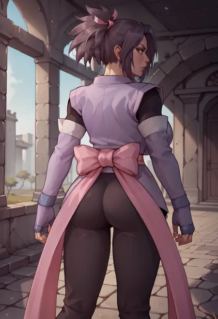 기본 외모: defSheena, 포니테일, 머리 리본, 일본 복장, 분리형 소매, 손가락 없는 장갑, 큰 가슴, 흉선, 흰색 브라, 오비, 분홍색 리본, 검은색 바지, 보라색 부츠