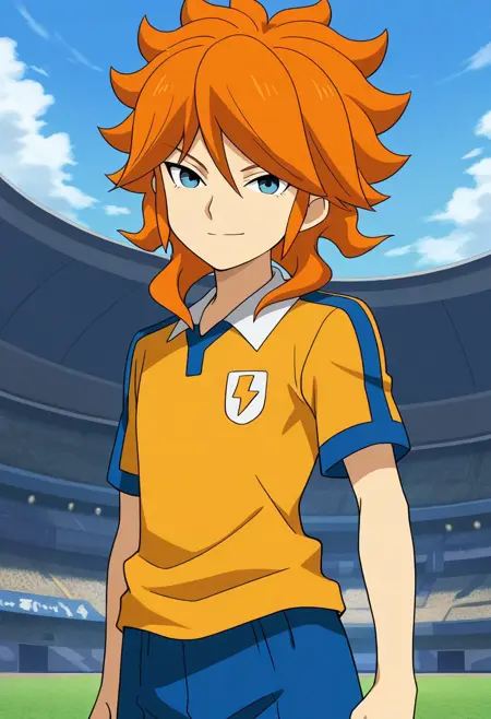 아메미야, 1남자, 남성 중심, 단독, 파란 눈, 주황색 머리, 라이몬 축구 유니폼, 셔츠, 노란 셔츠, 짧은 소매, 번개 문양, 반바지, 파란 반바지, 양말, 파란 양말, 신발, 운동화,