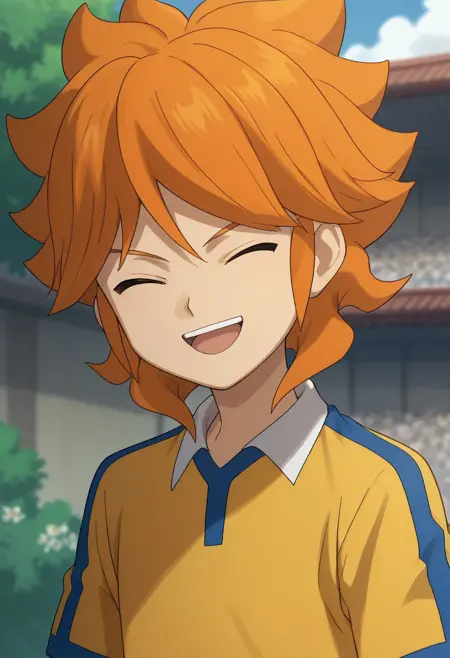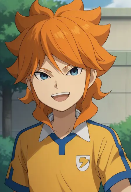 아메미야, 1남자, 남성 중심, 단독, 파란 눈, 주황색 머리, 라이몬 축구 유니폼, 셔츠, 노란 셔츠, 짧은 소매, 번개 문양, 반바지, 파란 반바지, 양말, 파란 양말, 신발, 운동화,