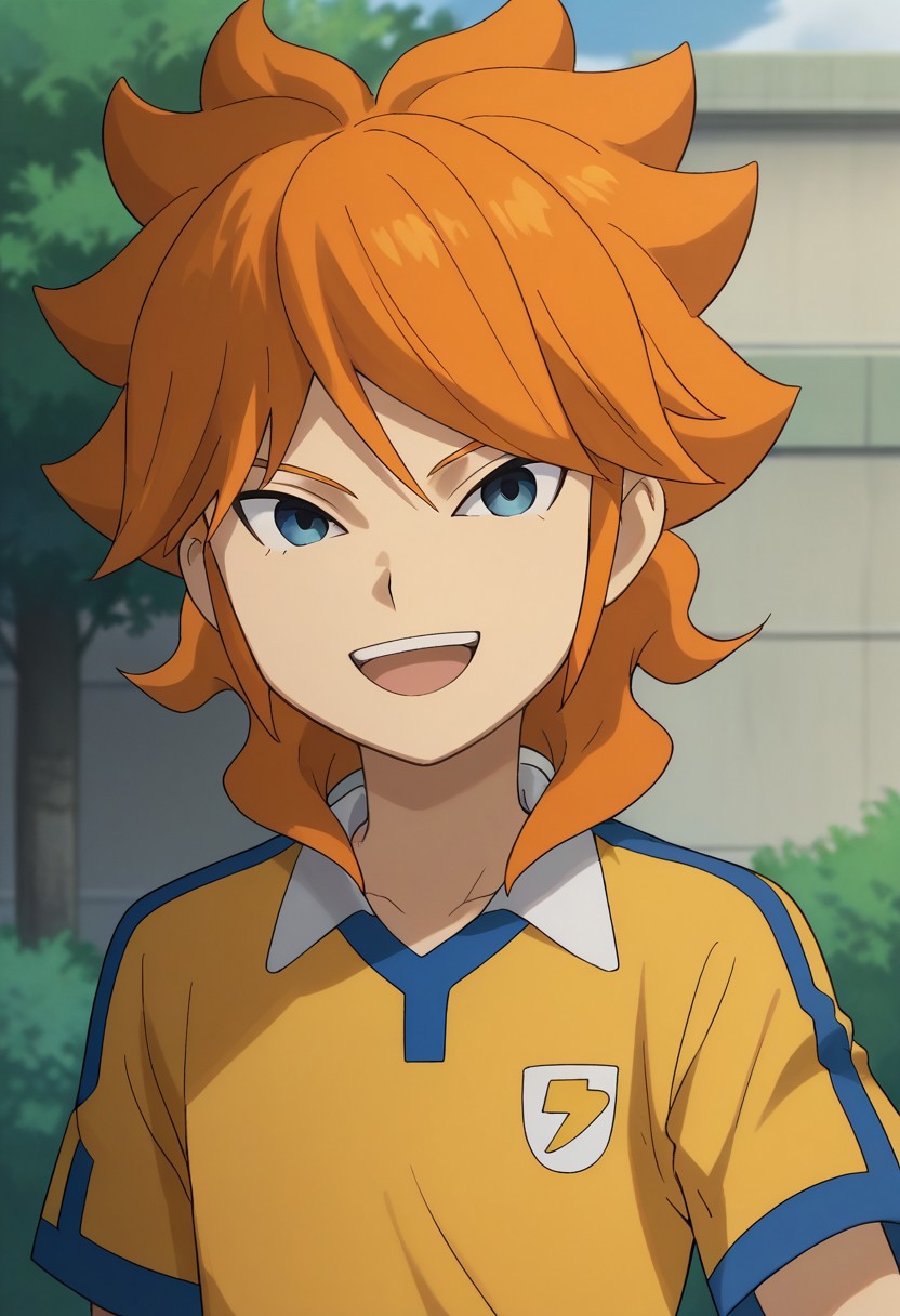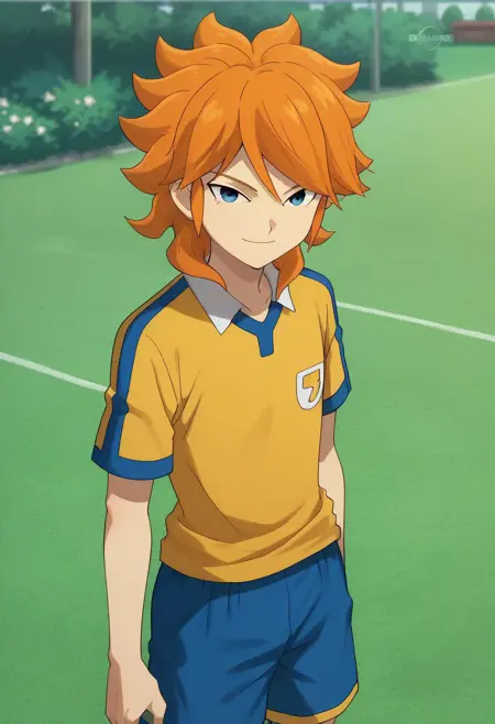 amemiya,1个男孩,男性聚焦,单人,蓝色眼睛,橙色头发,雷门足球队制服,衬衫,黄色衬衫,短袖,闪电符号,短裤,蓝色短裤,袜子,蓝色袜子,鞋子,运动鞋,