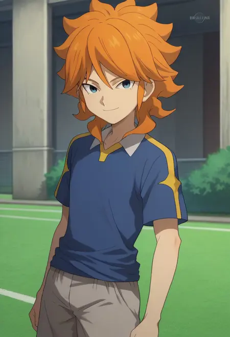 amemiya,1个男孩,男性聚焦,单人,蓝色眼睛,橙色头发,Arakumo足球队制服,衬衫,蓝色衬衫,短袖,护臂,短裤,灰色短裤,袜子,蓝色袜子,鞋子,运动鞋