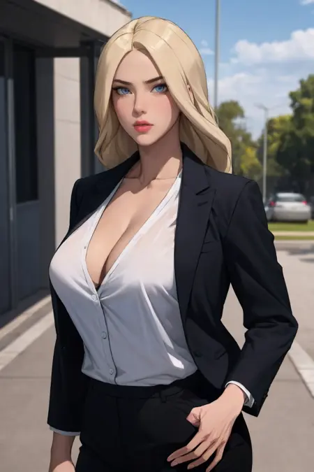 cleavage, jacket, pants, formal, suit, jewelry, black pants, open clothes, shirt, black jacket, sleeves rolled up, white shirt,