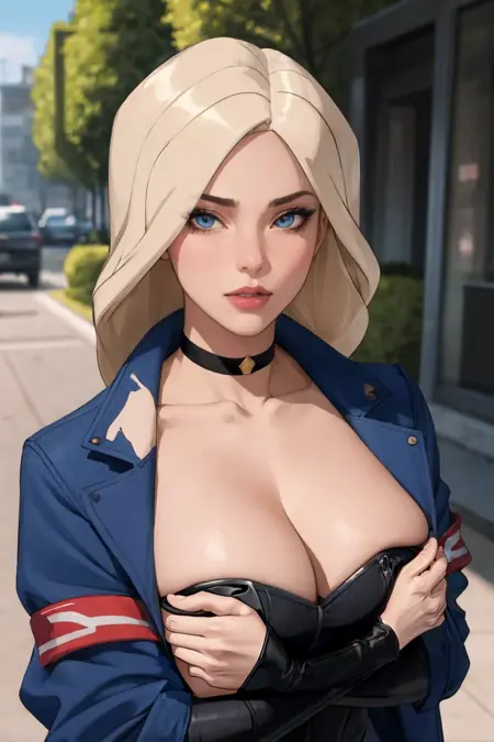 1girl, blonde hair, long hair, blue eyes, breasts, lipstick, makeup, collarbone, lips, large breasts, choker, black choker,