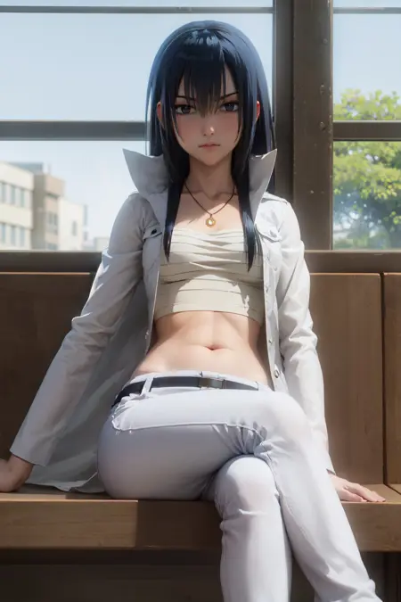 デフォルト衣装: コート、巻き布、白パンツ、ネックレス、ミッドリフ