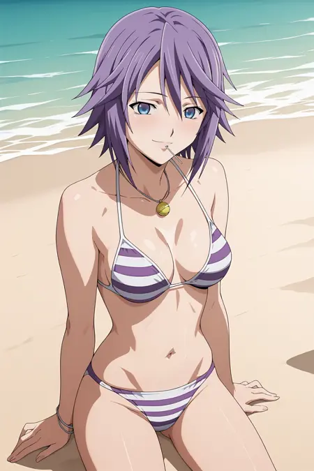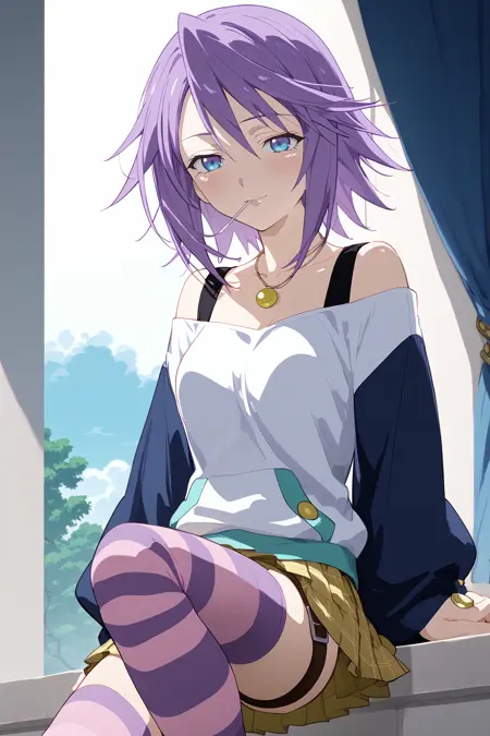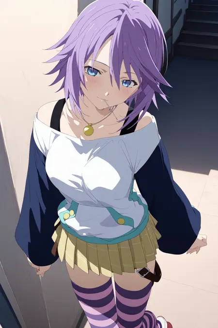 1girl, shirayuki mizore, rosario+vampire, short hair, purple hair, blue eyes, medium breasts, mizoreoutfit, long sleeves, striped thighhighs, pleated skirt, necklace, lollipop, one leg belt, striped panties, anime coloring, anime screencap,