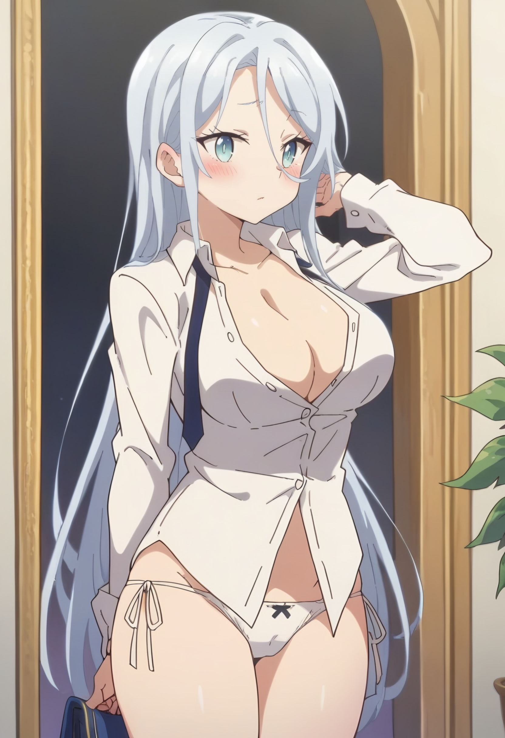 服装4:胸部显露、内衣、内裤、白衬衫、白色内裤、无外裤、侧系带内裤,移除马尾辫