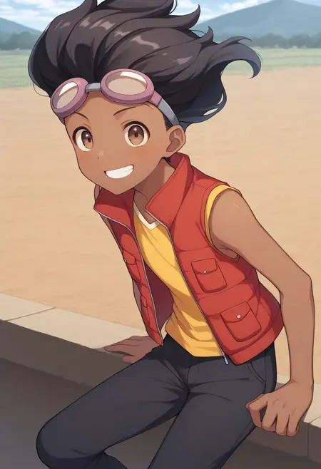 hamano, 1boy, male focus, solo, dark-skinned male, dark skin, brown eyes, black hair, goggles on head, shirt, yellow shirt, sleeveless, vest, red vest, capri pants, black pants,