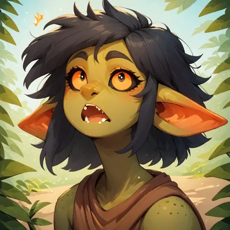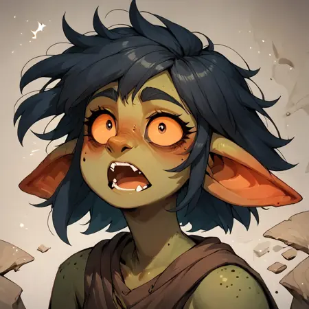 It should give you a consistant goblin girl with black sclera, yellow pupils small fangs and face framing hair bangs.