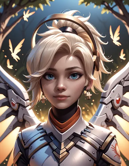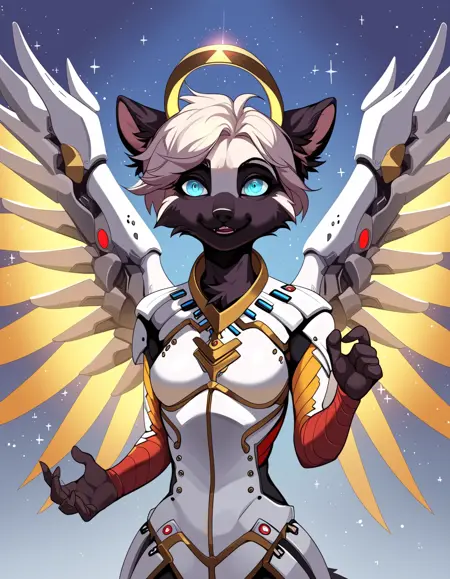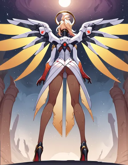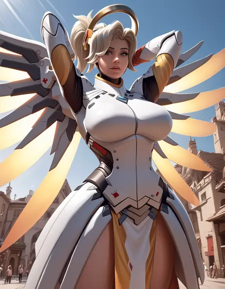 mercy的女武神套装如同守护天使一般,让她能贴近队友,并通过她的能力-mercy1卡杜修斯杖发出的光束为队友治疗、复活或增强力量。