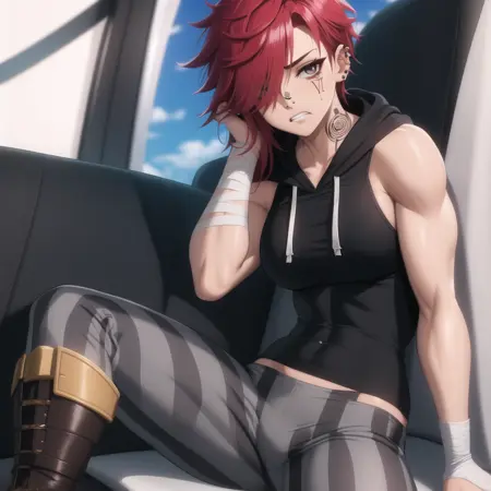For arcane version: lora:Viv220:0.8(vi, arcane, bandaged arm, red hair, hood, muscular female, jacket)