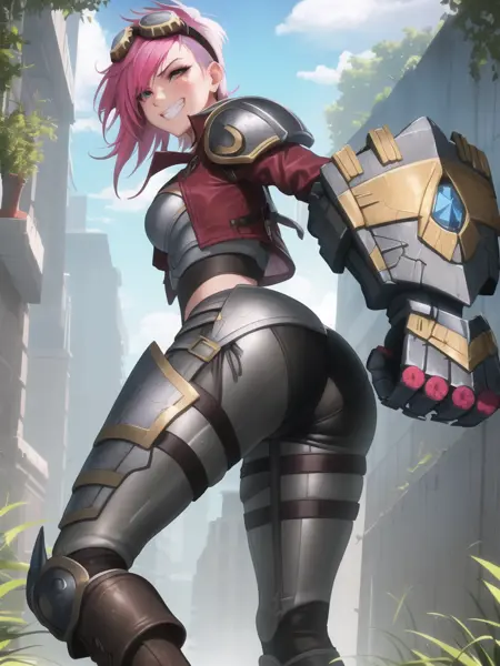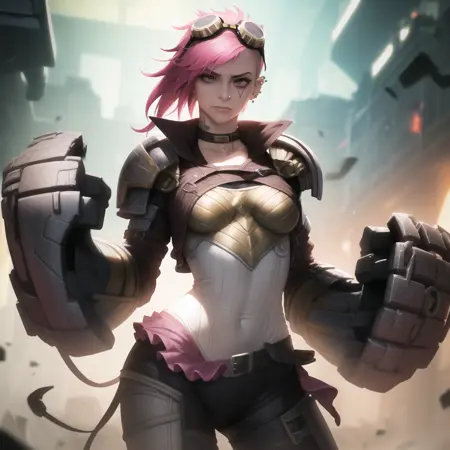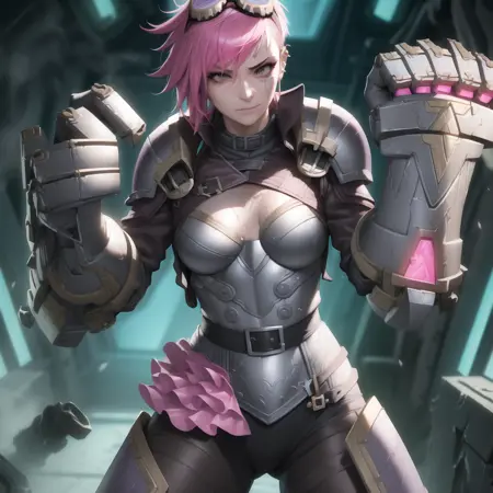 For original clothes: lora:Viv220:0.8(vi, original-clothes, gauntlets, pink hair, goggles on head)