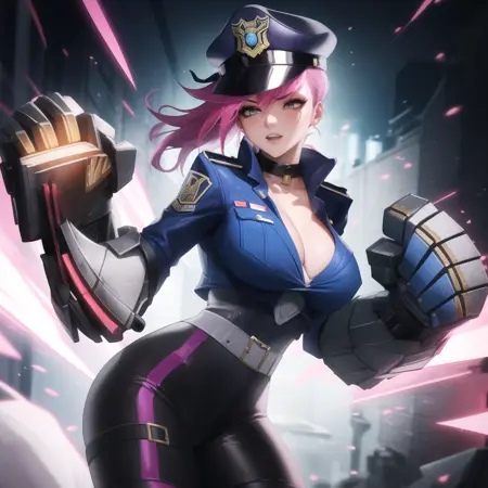 For police uniform: lora:Viv220:0.8(vi, police uniform, policewoman, gauntlets, pink hair, hat)