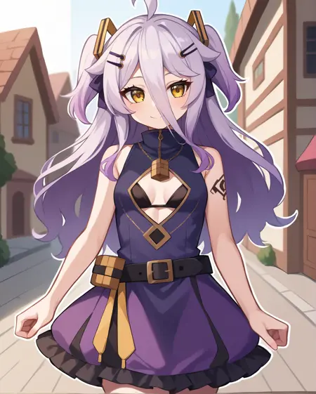 henya, 1girl, solo, long hair, bangs, hair ornament, dress, ribbon, hair between eyes, yellow eyes, very long hair, hair ribbon, purple hair, ahoge, small breasts, sleeveless, hairclip, belt, two side up, tattoo, sleeveless dress, purple dress, black belt
