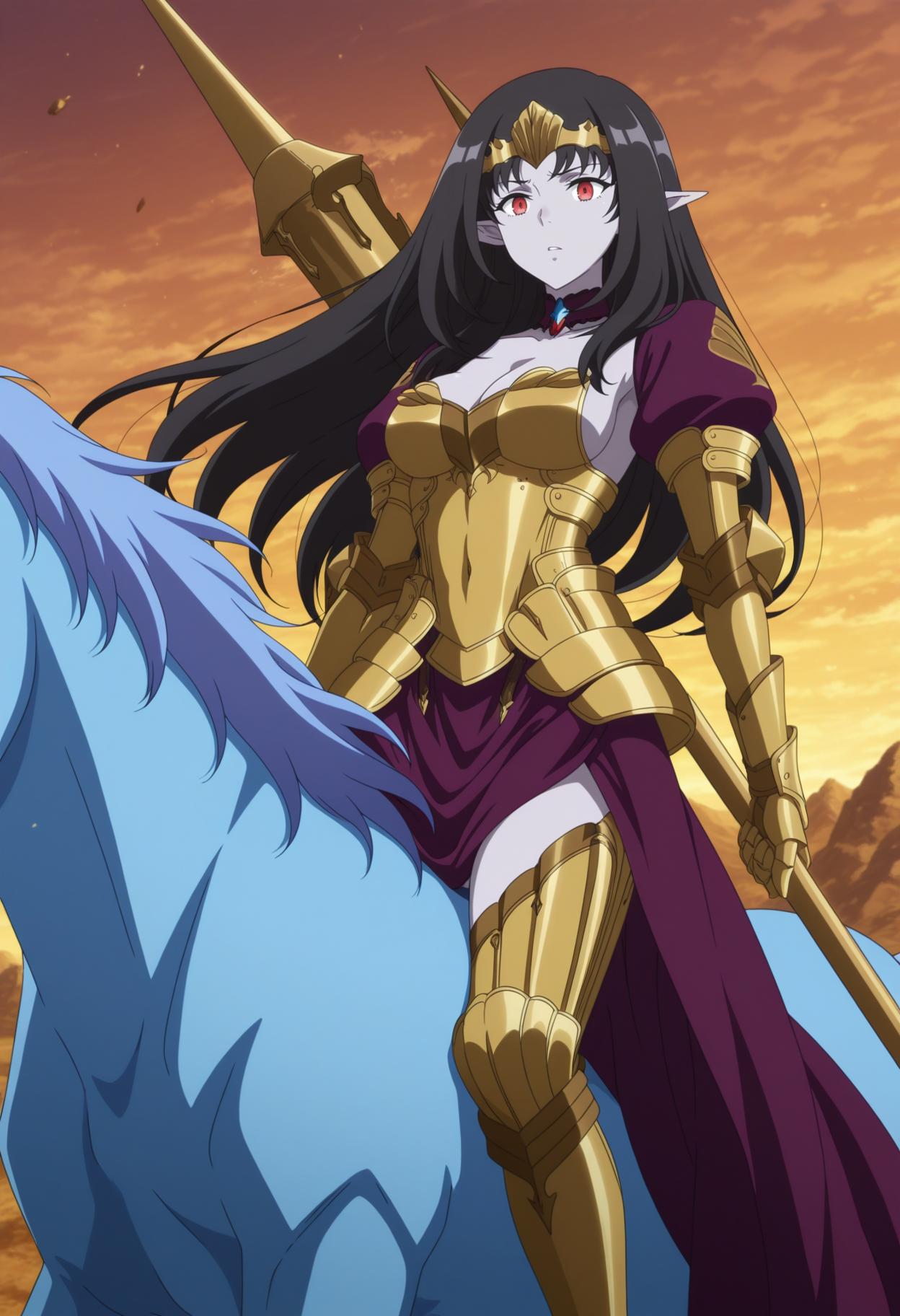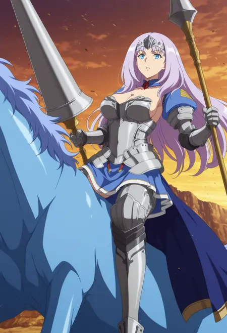 注目タグ:紫髪、青い瞳、輪冠、外側の襟、青いドレス、長袖、ふくらはぎ袖、胸元、鎧、サイドブック、脇の下、胸当て、脛当て、手甲