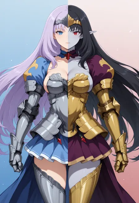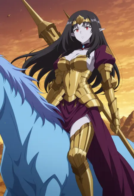 black hair, red eyes, pointy ears, grey skin, circlet, alternate official costume, detached collar, purple dress, long sleeves, puffy sleeves, cleavage, gold armor, sideboob, armpit, breastplate, greaves, gauntlets