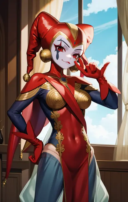 시작에 도움이 되는 예시 프롬프트: '하르 (크로노 크로스), 얼굴 화장, 빨간 레오타드, 투명한 파란색 하렘 팬츠, 장난이 담긴 모자'