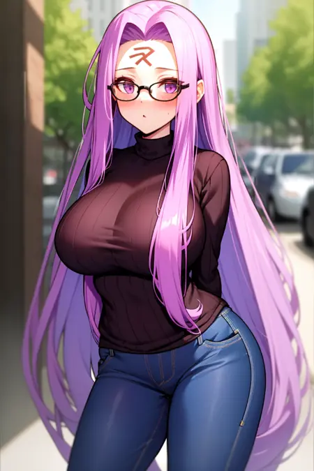 외모: 메두사, 보라색 눈, 이마 표식, 보라색 머리, 매우 긴 머리