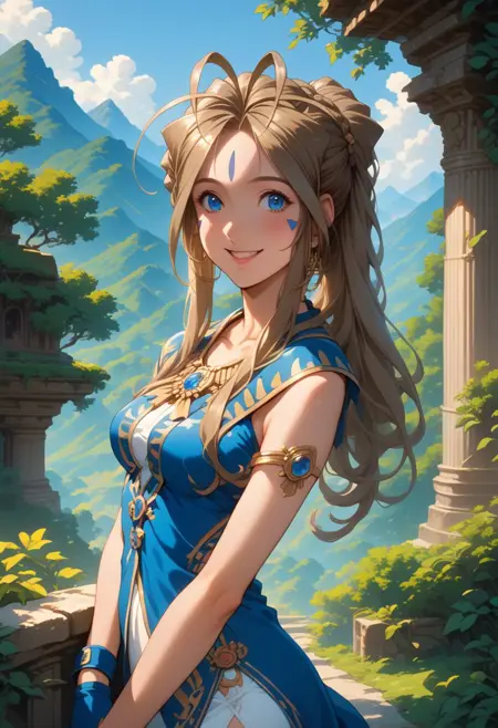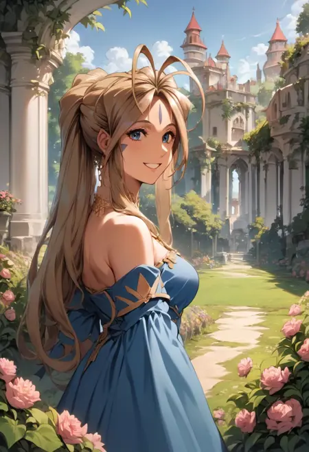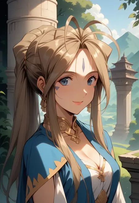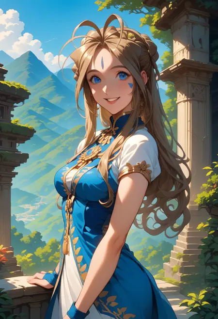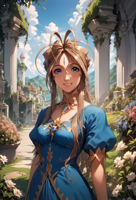 The facial markings and the rest of Belldandy's facial features are all included in the "Belldandy" tag, so no extra description is necessary. Adding them on top of that tag is going to mess them up, either their shape or color. Her outfits aren't included of course. While I could've trained the model to just make her official goddess dress, I find this very restrictive when it comes to generating other outfits.