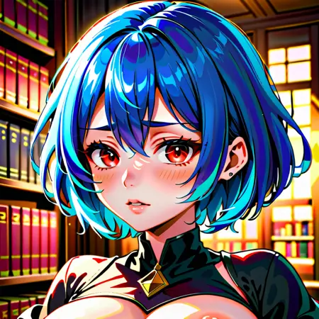 Example Prompt (1st Image): blue hair, short hair, white highlights, red eyes, symbol-shaped pupils, large breasts, grassy park background, masterpiece