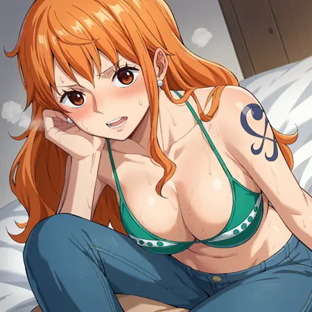 nami_post, 주황색 머리카락, 긴 머리카락, 물결 모양 머리카락, 옆머리, 갈색 눈, 큰 가슴, 어깨 문신
