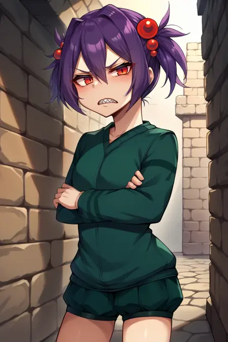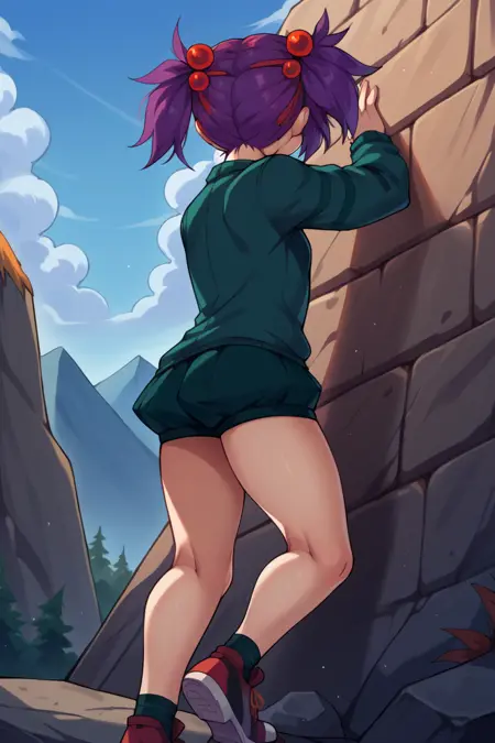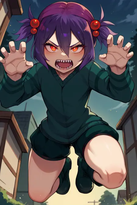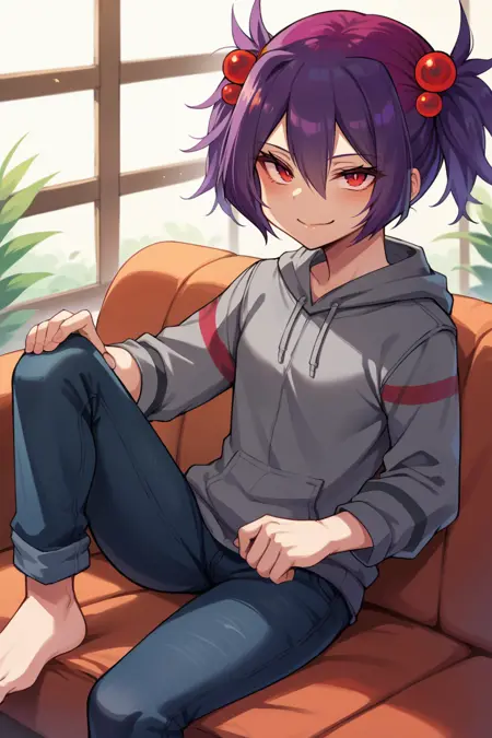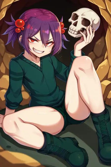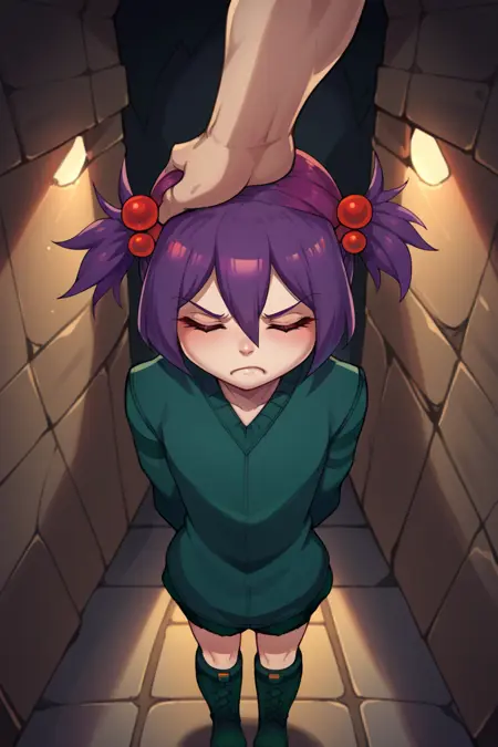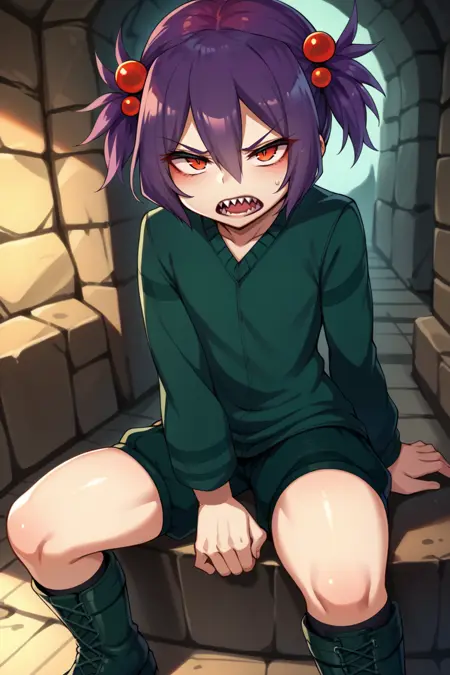트리거 단어는 "spid3r"이며, "짧은 트윈테일, 보라색 머리카락, 머리 끈"이 필수입니다.