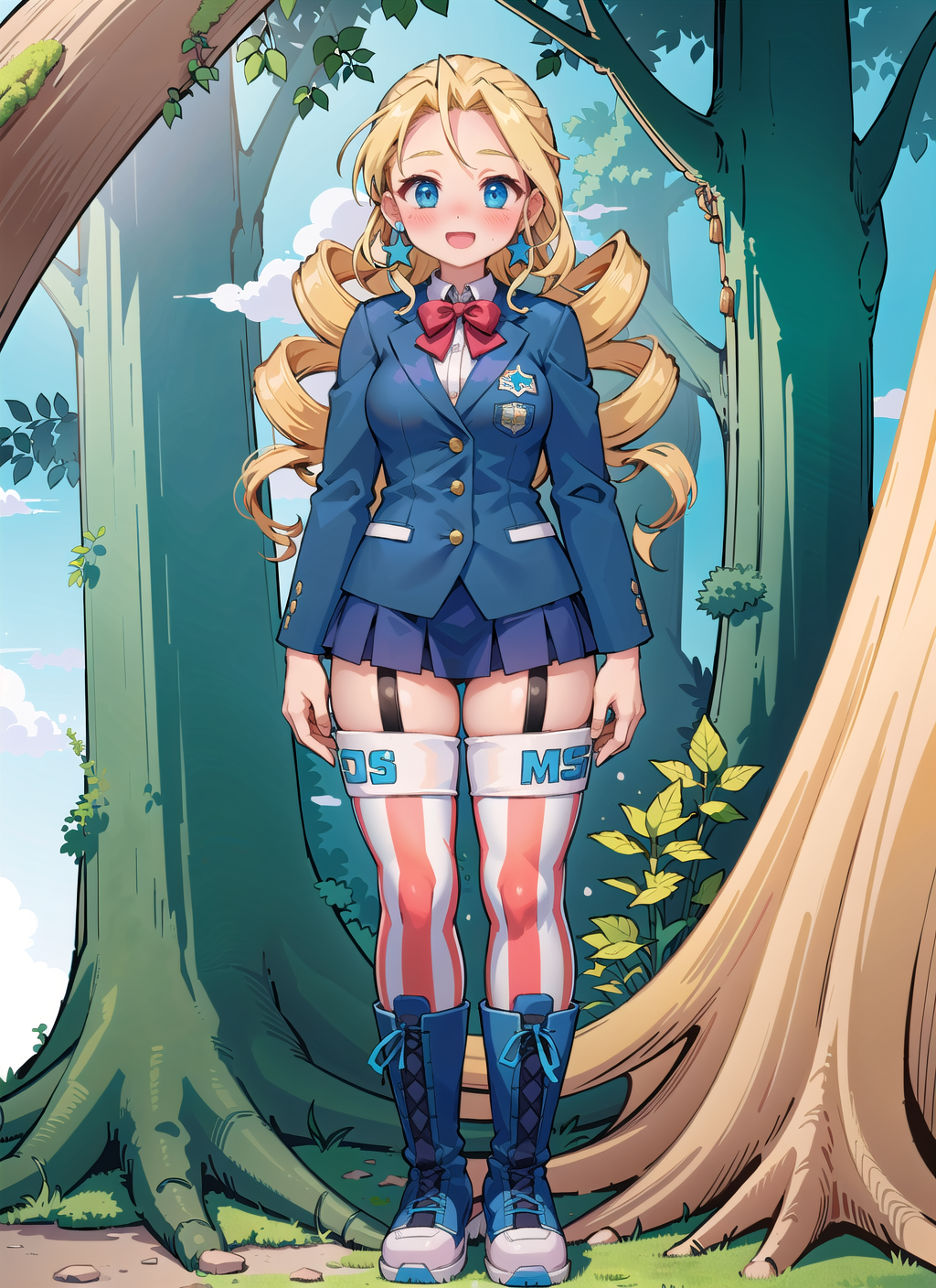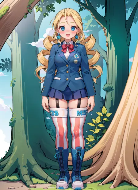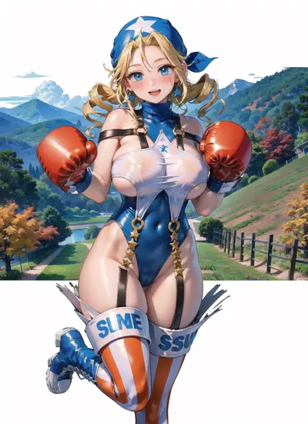 「tiffany lords」「justice gakuen」「blue bandana」「sleeveless turtleneck leotard」「highleg」「drill hair」「tight clothes」「curvy」「antenna hair」「blonde hair」「star ornament」「sideboob cutout」「vertical striped thighhighs」「thighhighs under boots」「blue footwear」「brown garter belt」「star earrings」などのプロンプト(トリガーワード)を使って、このセクシーなチアリーダーの絵を生成できるでしょう。そして、上記のプロンプトのほとんどを「blue jacket」に置き換えると、彼女のパシフィック高校の制服姿の絵も生成できます!この懐かしいゲームを覚えている方々に、このLoRAが喜びになりますように。