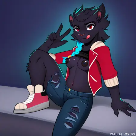 恋人たち: clairenLovers、フューリー、女性、ネコ、赤い目、黒い毛、黒い髪、青い編み髪
