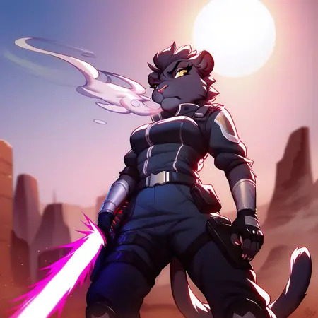 Ranger: clairenranger, furry, female, feline, red eyes, black fur, black hair, white armor