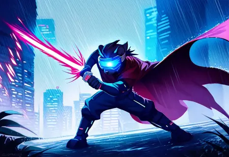 Outfit: visor, red cape, bodysuit, boots, sleeveless, energy sword