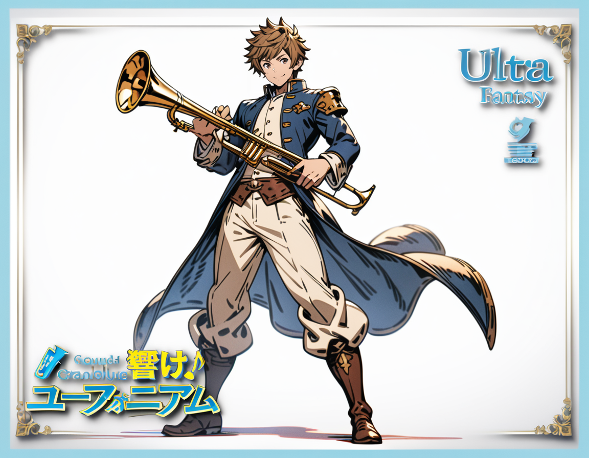 使用以下关键词可使其更具片头视觉效果:standing, looking at viewer, full body, holding instrument, holding, border, white background, blue border, logo, character name, english text, copyright name, title。