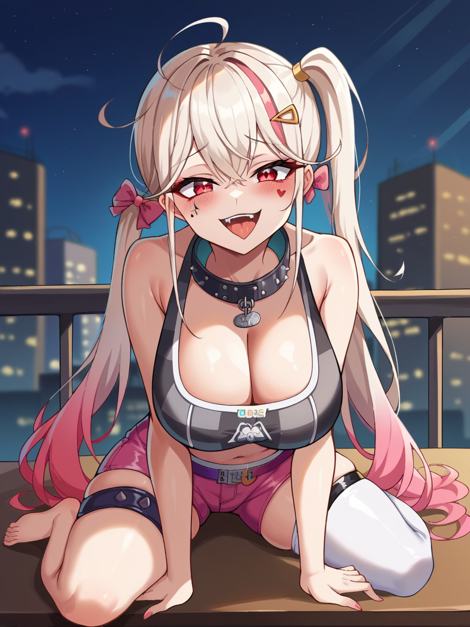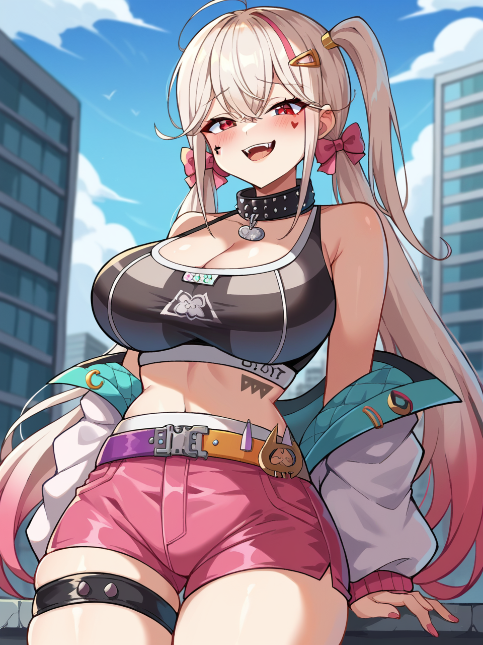 기본 외모: jackal_nikke, 1girl, solo, 긴 머리, 빨간 눈, 흰 머리, 트윈테일, 사이드 포니테일, ahoge, 얼굴 무늬, 머리 리본, 머리 장식, 재킷, 가슴 노출, 칼라, 헤어 클립, 허리, 한쪽 허벅지 양말, 핑크 샤츠